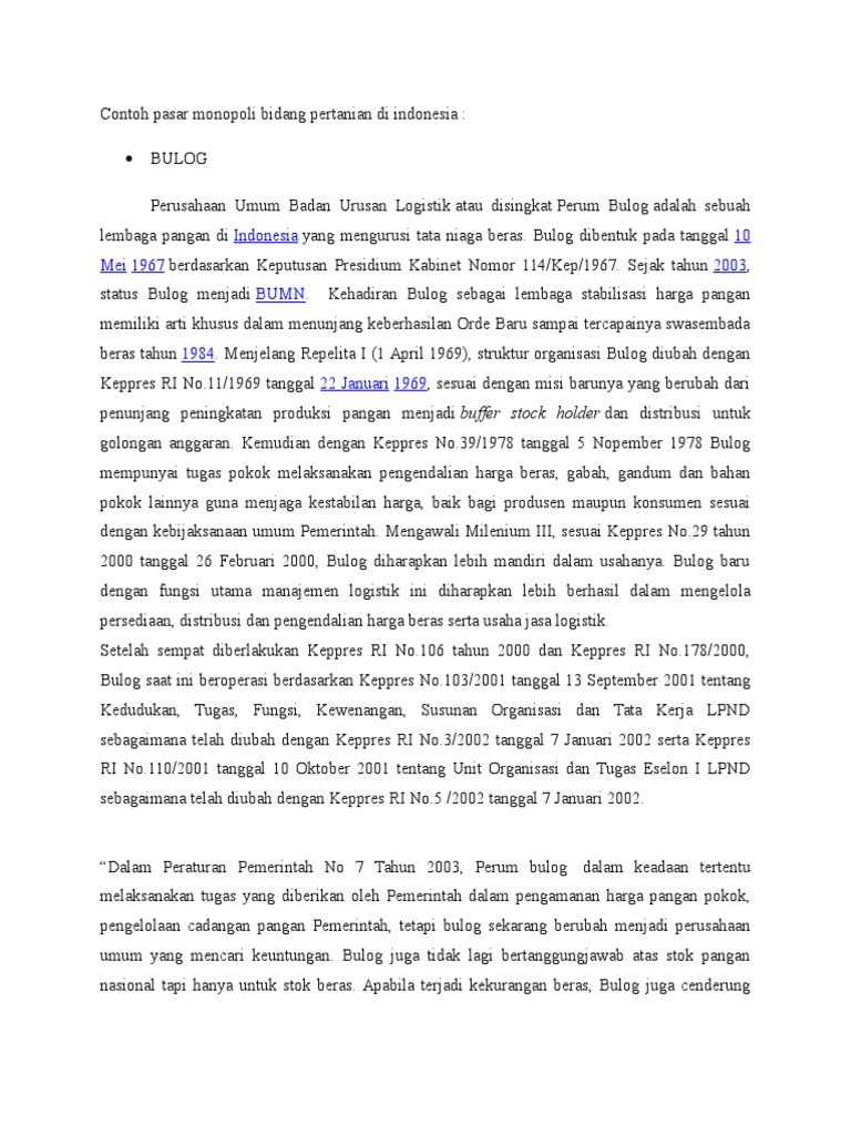 Ada banyak sekali contoh praktek monopoli perdagangan yang terjadi di indonesia yang bisa kita jelaskan dalam ulasan ukmsumut kali ini pasar monopoli bisa dilakukan oleh pemerintah atau negara, yang biasanya. Pasar monopoli merupakan sebuah bentuk pasar yang hanya memiliki satu penjual namun juga memiliki banyak pembeli.. Aneka tambang, perusahaan listrik negara, perusahaan air minum dan pt. Pasar monopoli murni atau pure monopoly. Jenis monopsoni yang paling umum adalah: